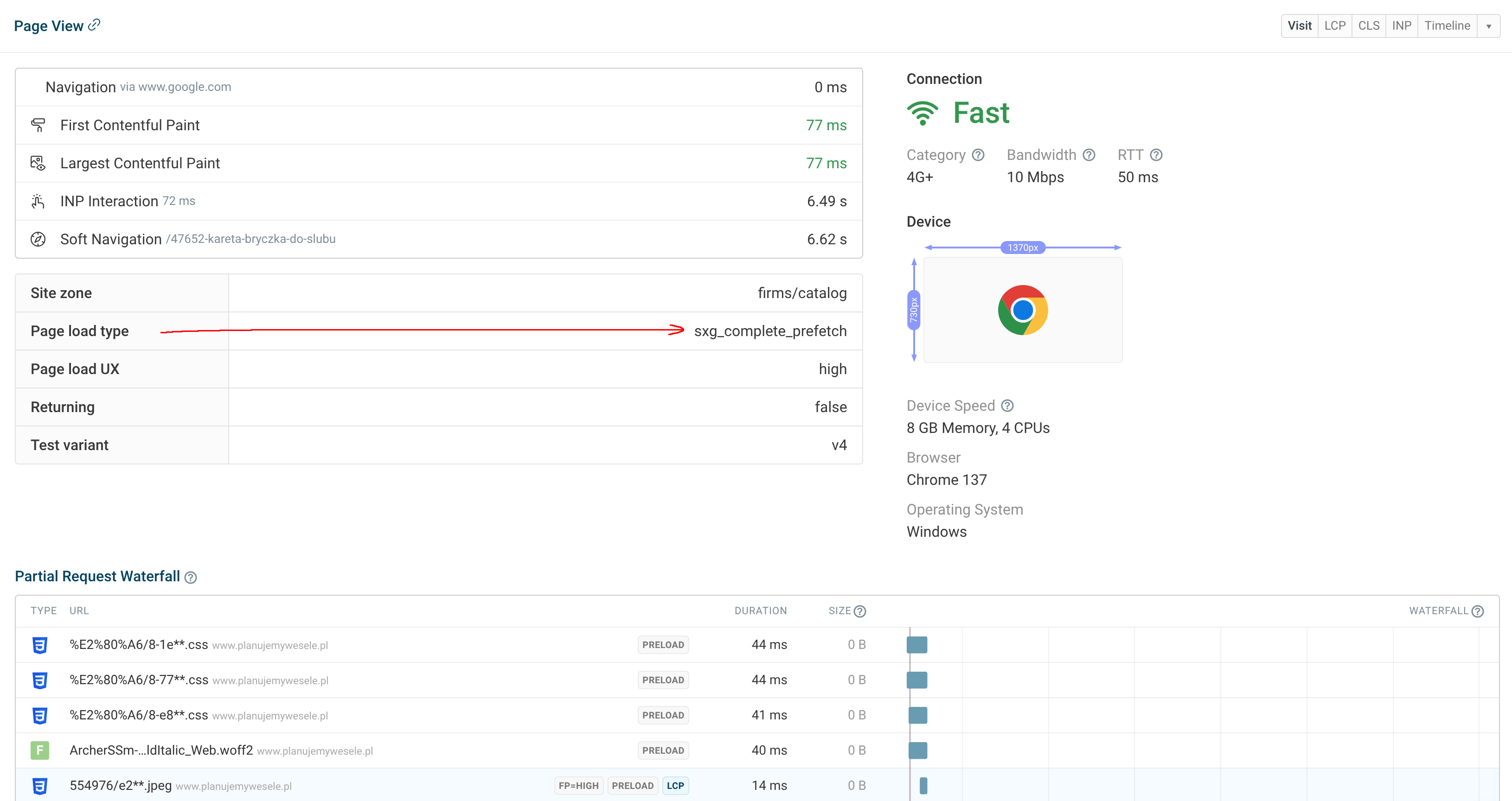 Shortly after deployment, I began receiving performance reports for each qualifying Google-referred visit, along with the page load type.